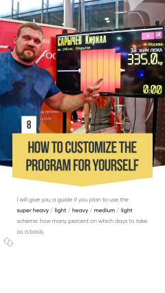 The guide is based on the experience of a world bench press champion. This is the concentration of all the most important strength growth factors, tested on himself.